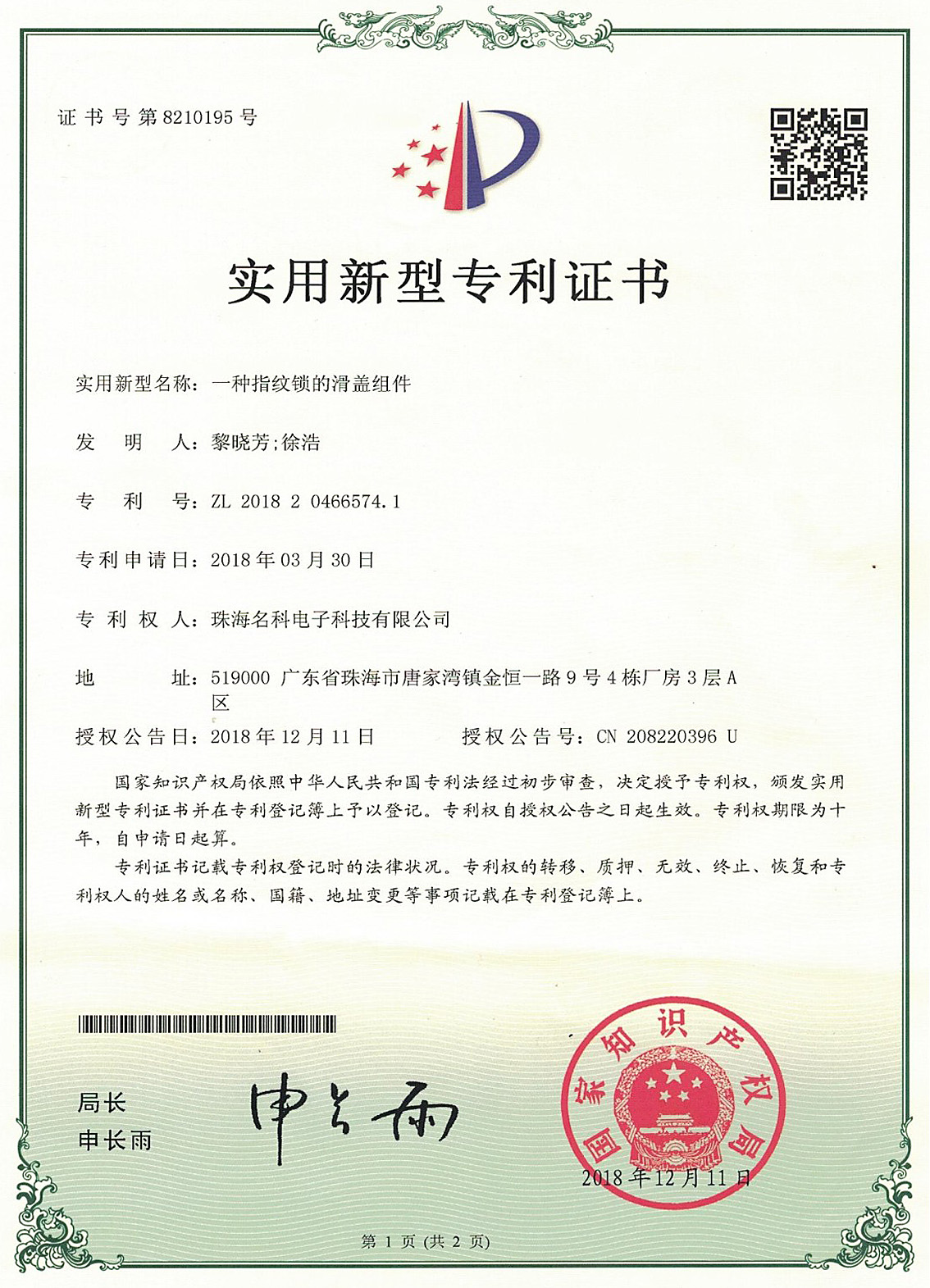 專利證書-指紋滑蓋組件